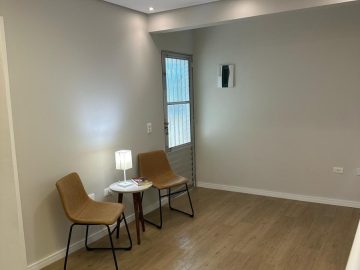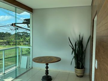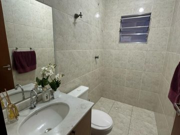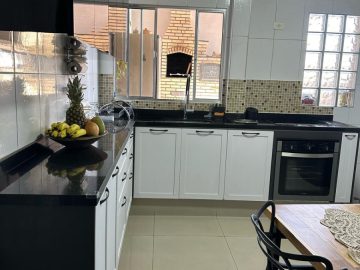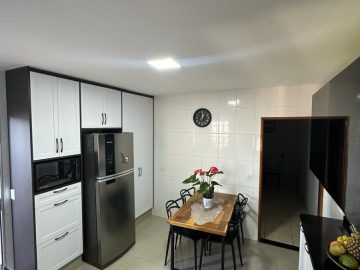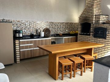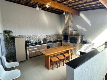 No pavimento superior, a casa conta com dois dormitórios amplos e uma suíte com varanda coberta, além de um banheiro social e uma aconchegante sala íntima. No térreo, a ampla sala de estar integrada à sala de jantar garante um ambiente moderno e acolhedor. A cozinha, no estilo provençal, é equipada com armários planejados e se conecta ao espaço gourmet coberto, ideal para receber amigos e familiares. O imóvel ainda oferece lavanderia com banheiro de apoio e garagem coberta para dois carros.